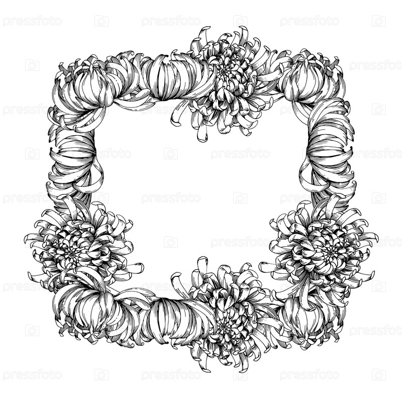 Квадратная рамка для почек из хризантемы. ручной иллюстрация. Для дизайна упаковки, карт, обложек, принтов, этикеток на продуктах и тканей