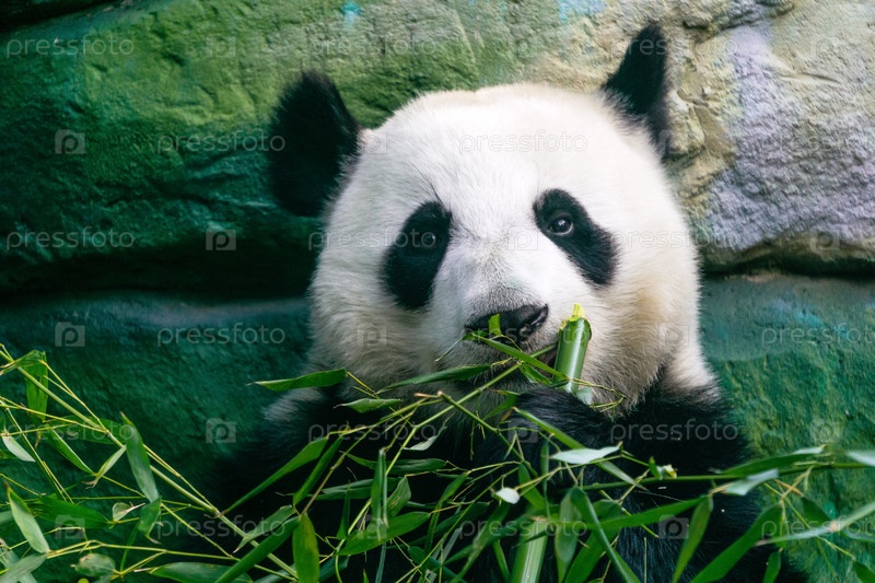 Гигантская панда ест бамбук, ближайший портрет