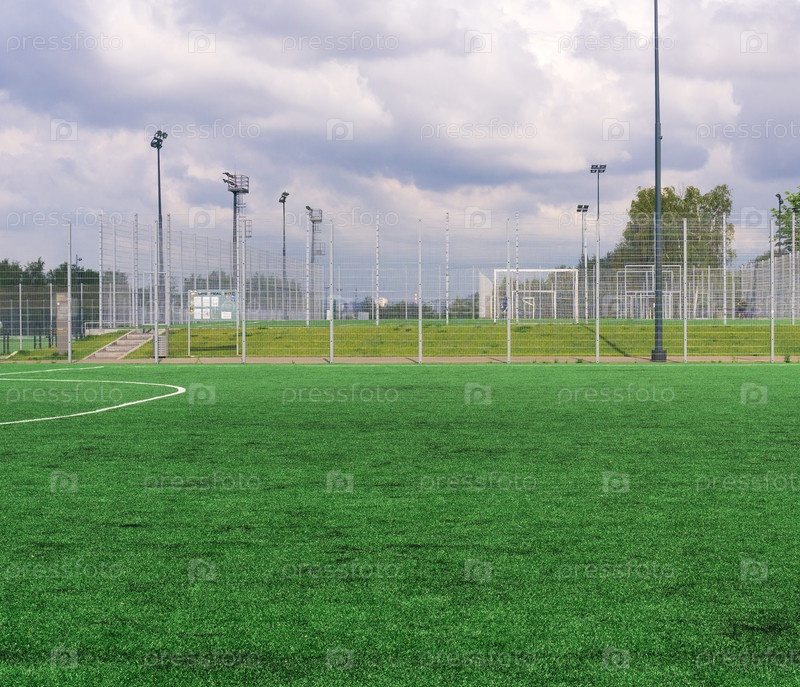 Спортивные площадки и футбольное поле с зеленой травой и голубым облачным небом на заднем плане