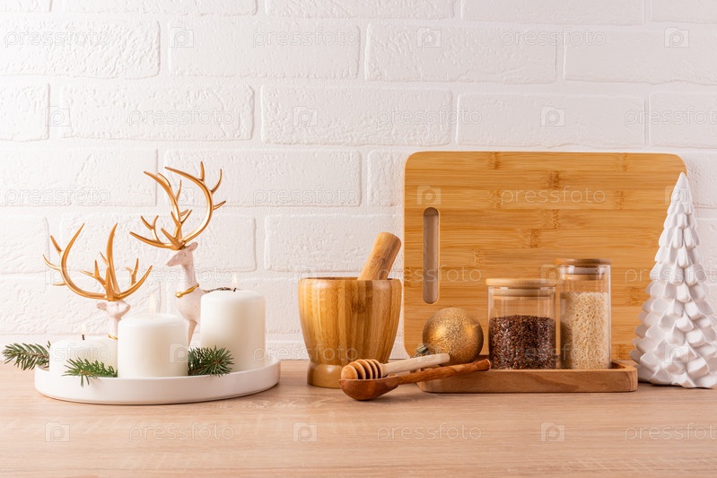 Красивый фон для кухни: рождественская столешница, банки с пряностями, миномет с пестилем, тарелка со свечами и олень