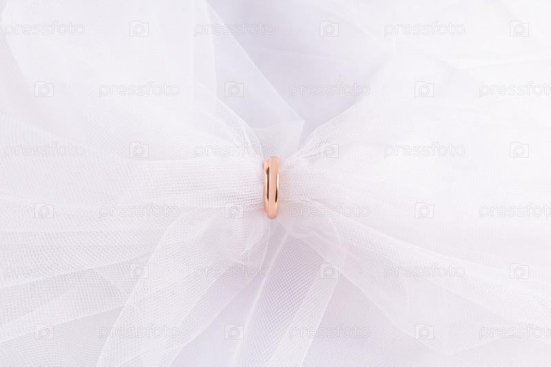 Пара золотых обручальных колец носится над классической белой вуалью невесты. отличное оформление свадьбы для дизайна приглашений и открыток. вид сверху. место копирования
