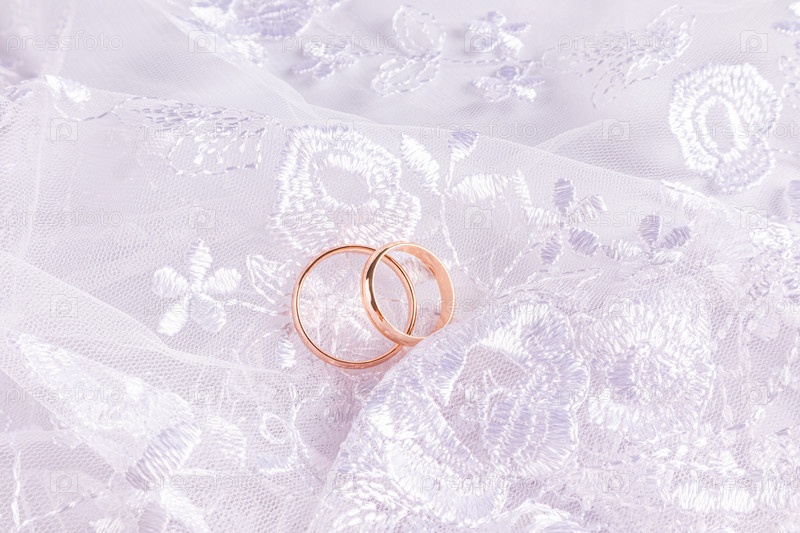 Два золотых классических кольца лежат на шикарной белой кружевной ткани платья невесты. мягкие складки гипсовой ткани. свадебная концепция