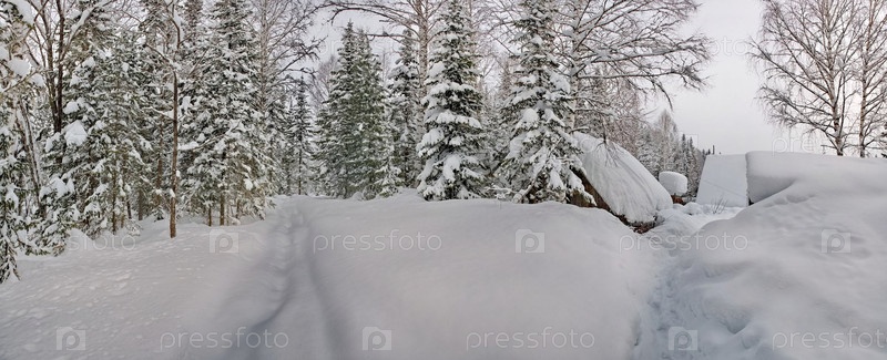 Россия. Кузнецк Алатау. Зимний вид на пригородную деревню Борисовка среди заснеженной непроходимой тайги на берегу реки Том