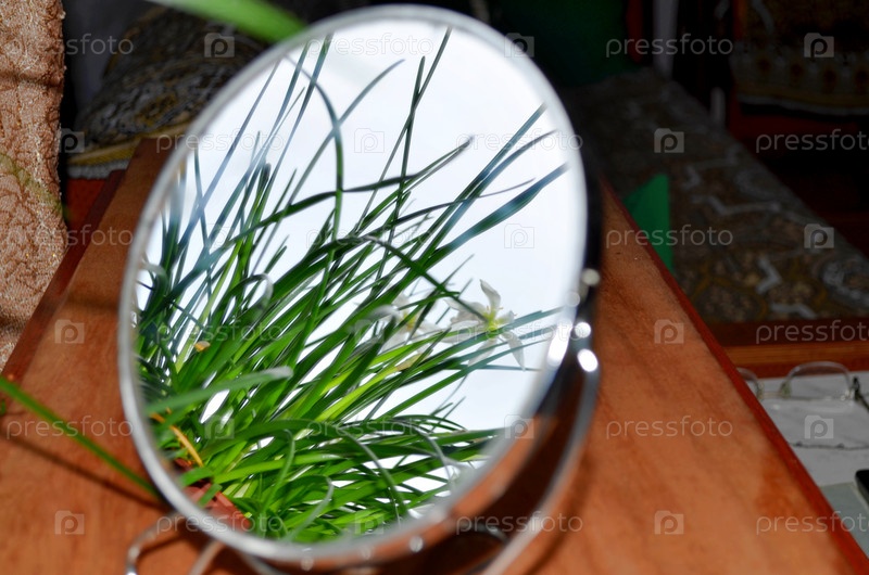 Круглое зеркало стоит на столе, в отражении - зеленая трава