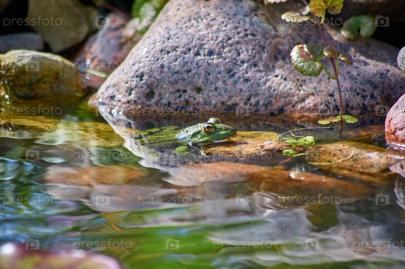 Лягушка сидит в воде возле скалы