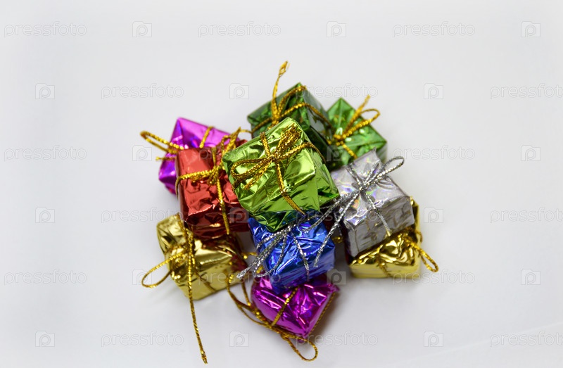 Многие небольшие цветные коробки для поздравлений на белом фоне
