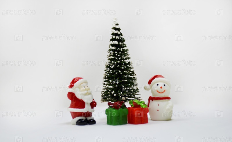 Рождественская открытка: Санта-Клаус, снеговик, ель и подарки на белом фоне. концепция празднования Рождества и Нового года, поздравления с праздником и вручение подарков