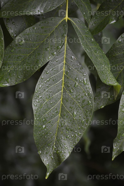 Красивый природный фон с зелеными листьями грецкого ореха с каплями воды после дождя. обои из грецких орехов