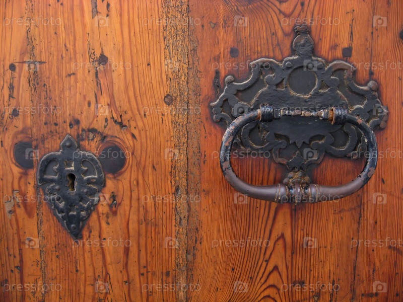 Старинные ручка и накладка на замочную скважину на деревянной поверхности