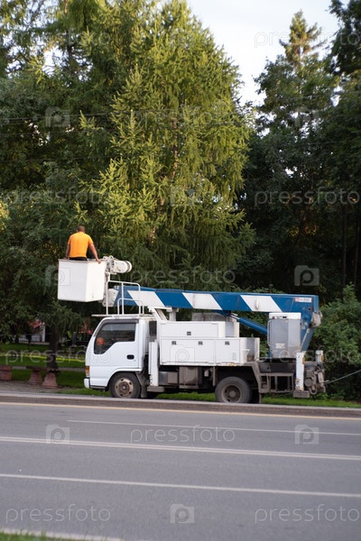 Работник на автомобильной башне украшает или обрезает деревья