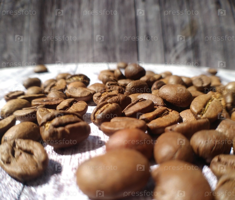 Кофейные бобы крупный план в лучах света на деревянной поверхности