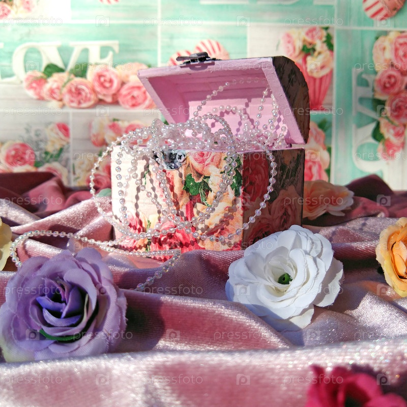 Небольшой декоративный сундук с ювелирными украшениями и костюмами на поверхности из красной ткани. коробка открыта, от нее висят жемчужные бусы. возле искусственных цветочных почки