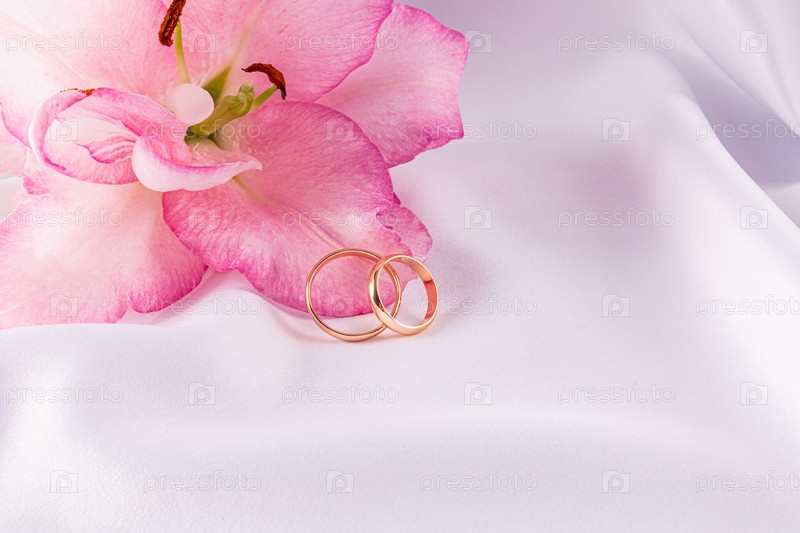 Два золотых обручальных кольца лежат на лепестке нежной цветочной лилии. белый атласный фон. пространство для копирования. концепция открытки, приглашение