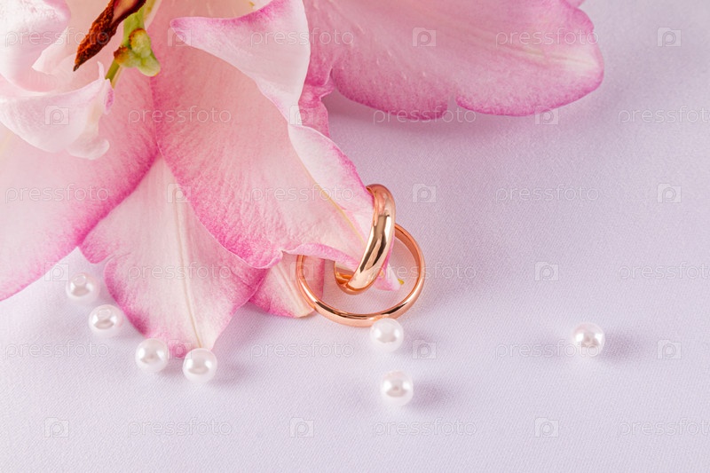 Пара золотых обручальных колец, привязанных к лепестку нежной розовой лилии. Белый атласный фон с жемчужинами. Концепция свадьбы. Копия пространства