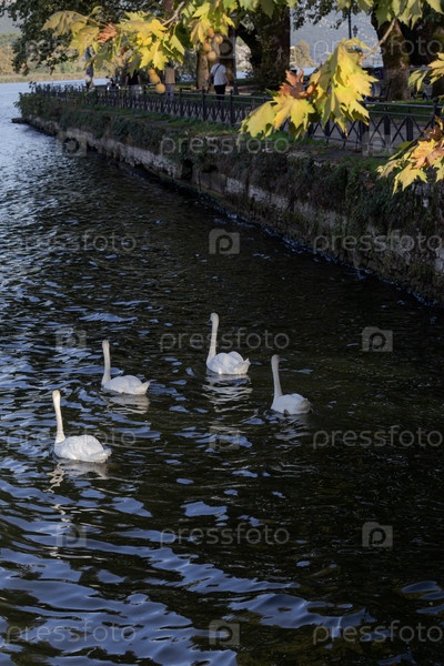 Белые, элегантные и красивые лебеди плавают возле набережной