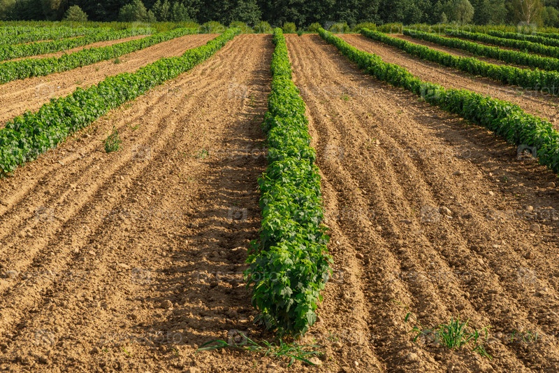 Ряд саженцев черной смородины в питомнике под открытым небом показывает молодые растения, готовые расти и расти
