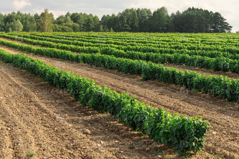 Ряд саженцев черной смородины в питомнике под открытым небом показывает молодые растения, готовые расти и расти