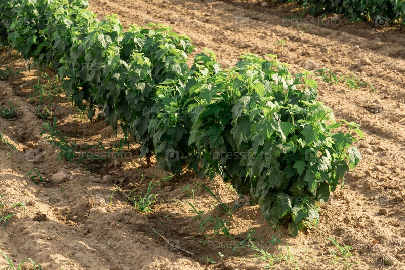 Ряд саженцев черной смородины в питомнике под открытым небом