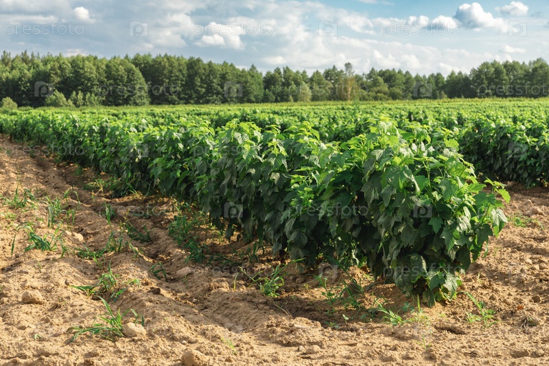 Ряд саженцев черной смородины в питомнике под открытым небом