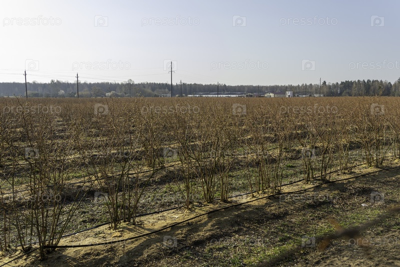 Хорошо ухоженная черника ферма с аккуратными рядами кустарников и автоматизированной ирригационной системой весной