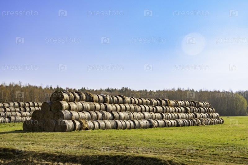 Большая куча соломы катится на поле под голубым небом, приготовленная в качестве зимнего корма для животных