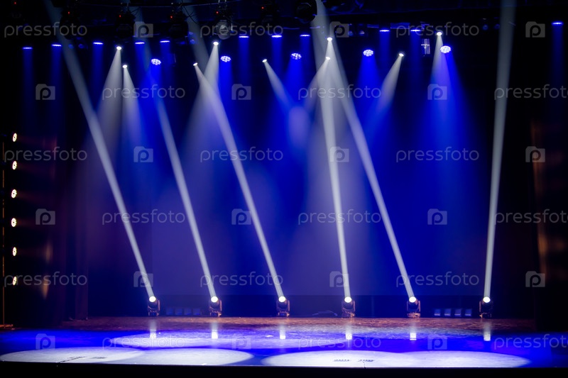 Пустая театральная сцена, освещенная синим светом и несколькими прожекторами.Сцена создает ожидание спектакля или события в большом аудитории