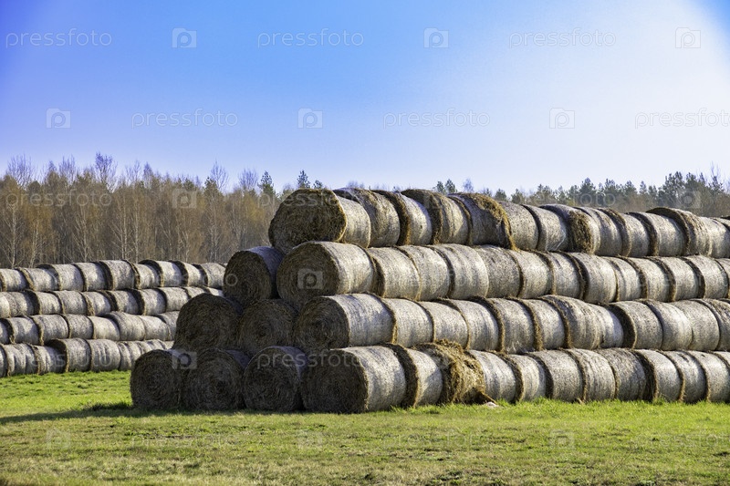 Большая куча шариков соломы на поле под голубым небом, приготовленная в качестве зимнего корма для животных