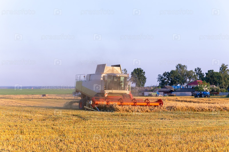 Сборщик собирает спелый ячмень под теплым светом заходящего солнца возле фермы, демонстрируя современные сельскохозяйственные технологии во время сезона сбора урожая