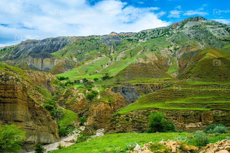 Живописный горный пейзаж с фермерским домом на крутом берегу горной реки