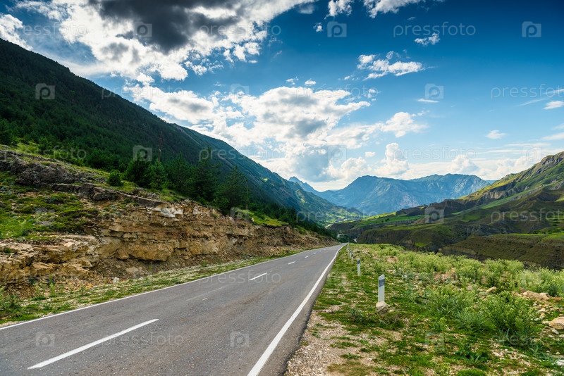 Красивый горный пейзаж с дорогой среди зеленых гор в Дагестане. Кавказ