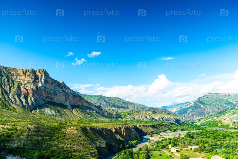 Живописный горный пейзаж долины Горной реки в Дагестане.Кавказ