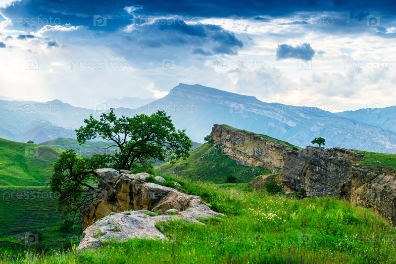 Живописный горный пейзаж с деревом на крутой скале.Северный Кавказ