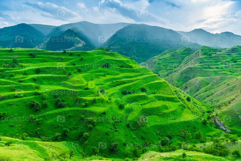 Живописные террасы на зеленых склонах гор Северного Кавказа