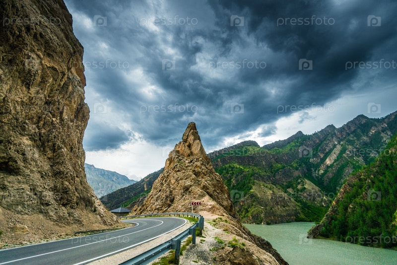 Драматический горный пейзаж с изогнутой горной дорогой на краю скалы в долине реки