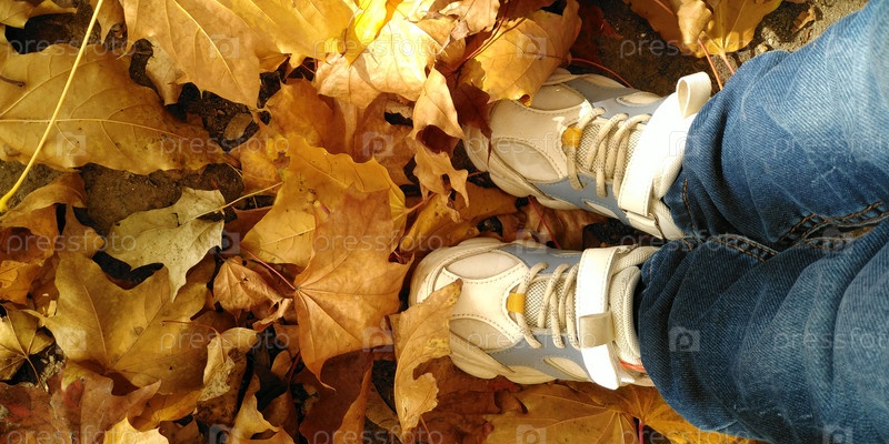 Ноги в кроссовках на ярком фоне упавших осенних листьев