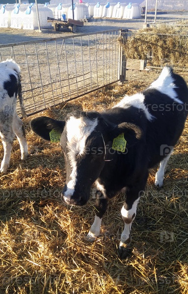 Маленький телят в падоке на животноводческой ферме