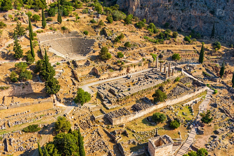 Делфы, Греция. Руины древнего города. Древний театр Дельфов, храм Аполлона. Летнее утро. Вид с воздуха