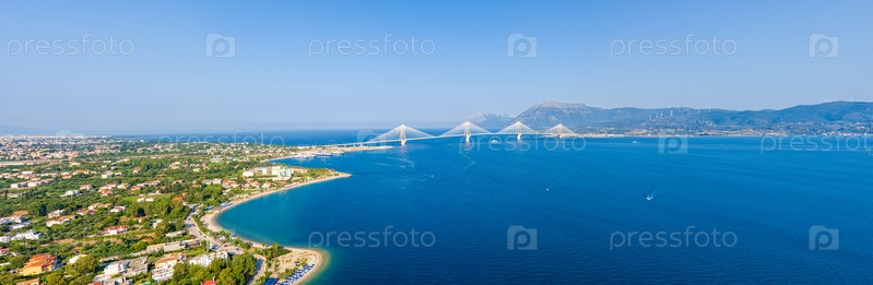 Рион, Греция.Рион - это Андрион.Дорожный и пешеходный мост через Коринфский залив.Летний день.Вид с воздуха