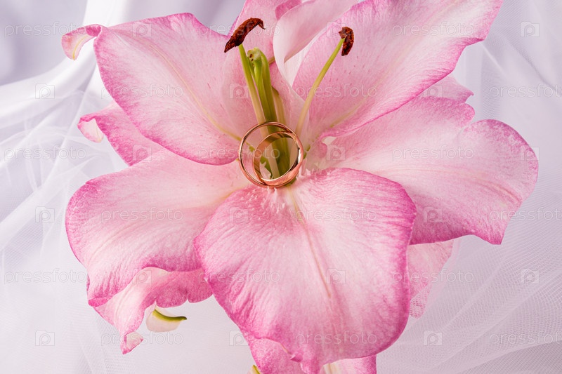 Два шикарных золотых обручальных кольца носят на пестиле розового лилия. Вид сверху. Свадебная концепция любви и верности