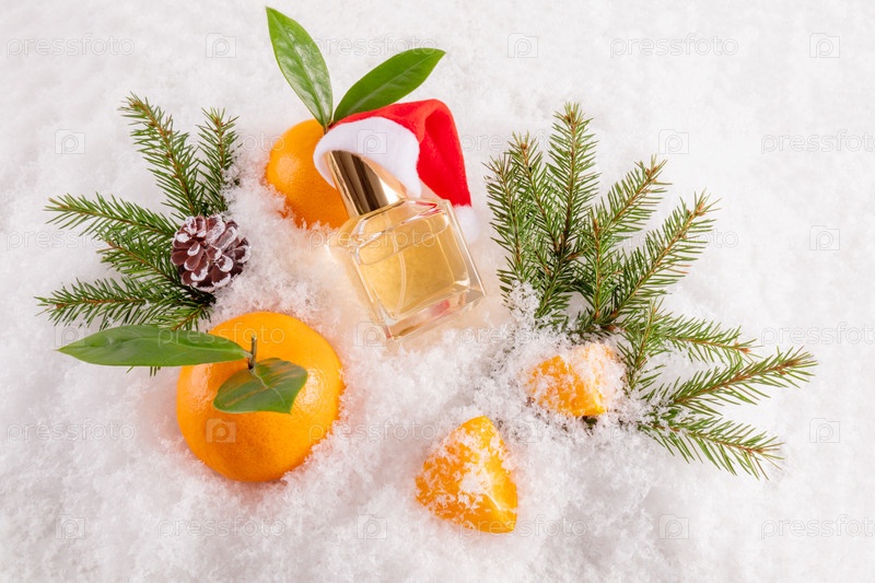 Бутылка парфюма в шляпе Санта-Клауса, опирающаяся на мандарин в снегу. Пустая бутылка макетов. Презентация новогоднего аромата, продукта