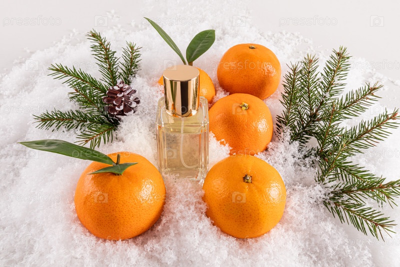Бутылка косметики, парфюм на белом пушистом снегу среди мандаринов и веток елей. модель пустой бутылки. презентация новогоднего продукта