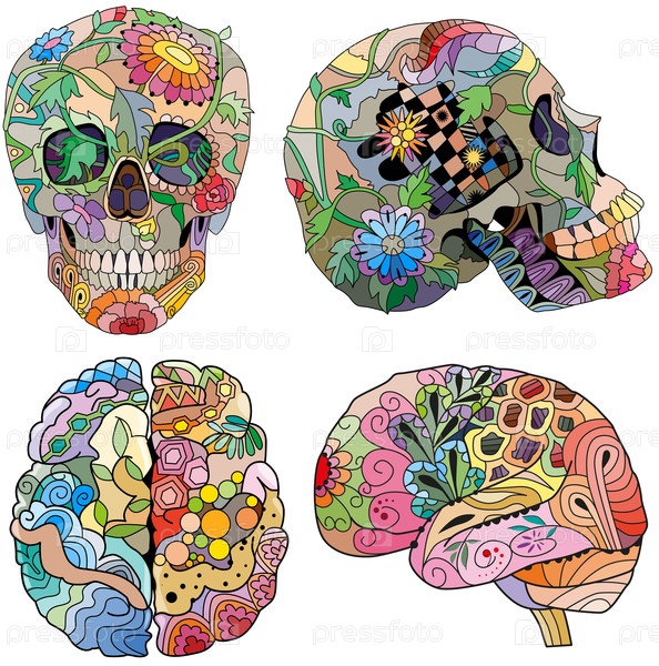 Зентангл стилизовал мозг и черепа. ручная декоративная векторная иллюстрация