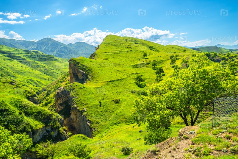 Живописный вид на горы с зеленым склоном и глубоким скалистым ущельем