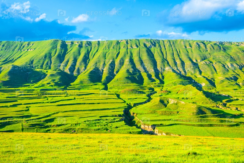 Невероятно красивый вид на древние зеленые склоны горного плато с эрозией и естественными террасами геологических отложений