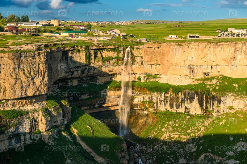 Прекрасный вид на Итальянские водопады, падающие с края крутой стены глубокого Цолотлинского каньона в горах Северного Кавказа