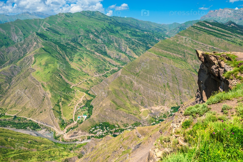 Прекрасный вид на плоскую длинную скалу 'Язык горного тролля' над пропастью глубокого горного ущелья Северного Кавказа