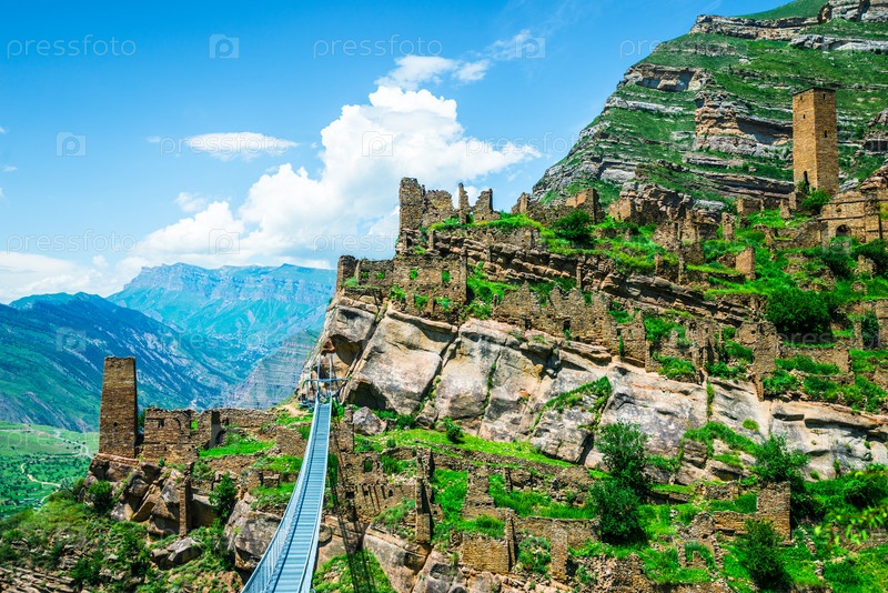 Горный висячий мост, ведущий к руинам деревни Кахиб.Современный Северный Кавказ