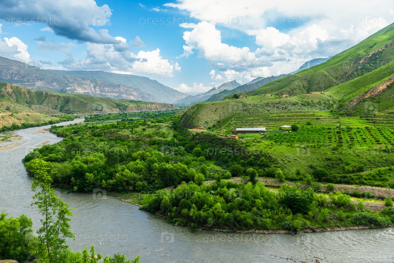 Живописный горный пейзаж фруктовой фермы на склоне горы возле горной реки