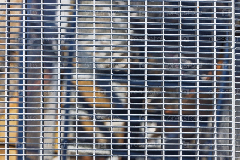 Абстрактная решетка окон обрамляет подвешенную металлическую платформу