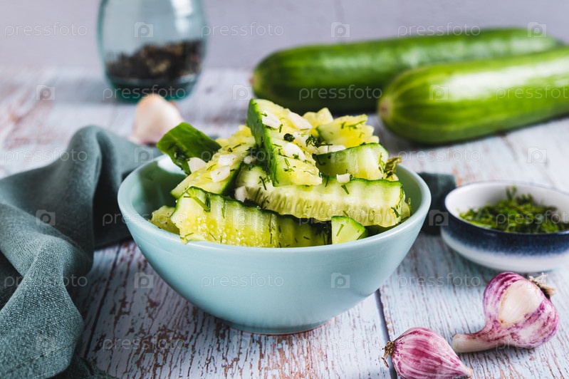 Легкосоленые огурцы с укропом и чесноком в миске на столе